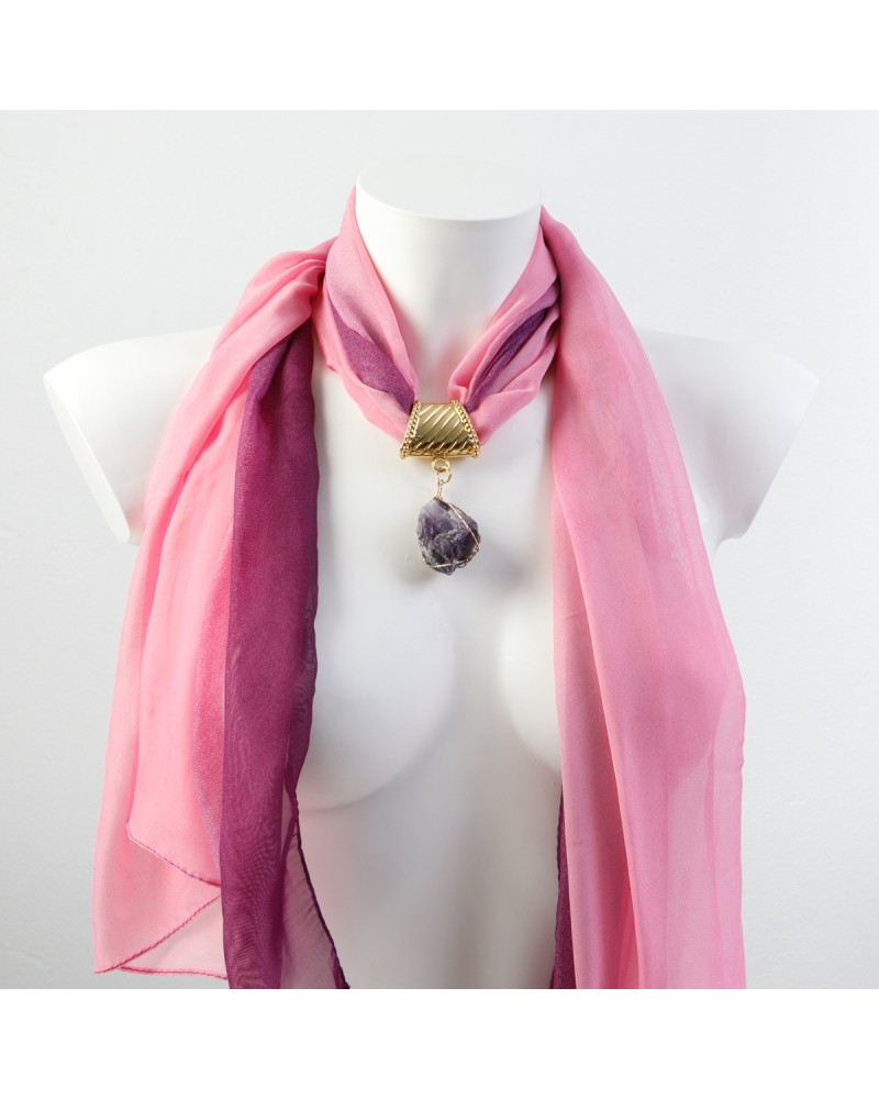 Foulard dégradé rose/violet, pierre améthyste, sertie de fil doré, bélière doréee argentée