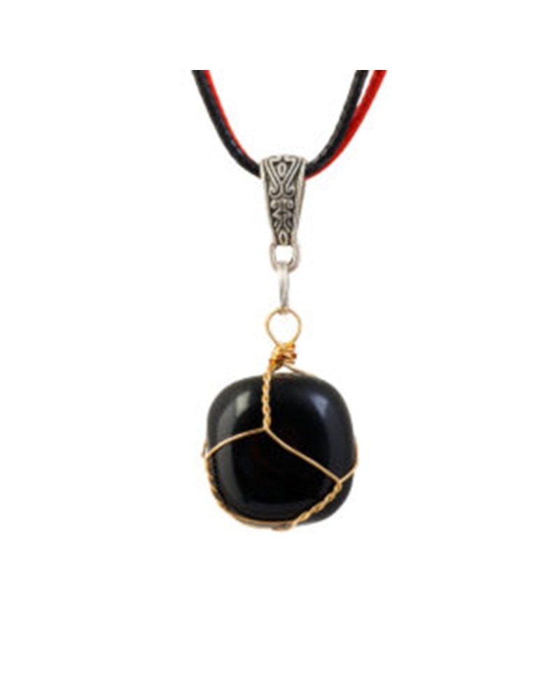 Pierre obsidienne sertie de fil doré, cordons rouge et noir.