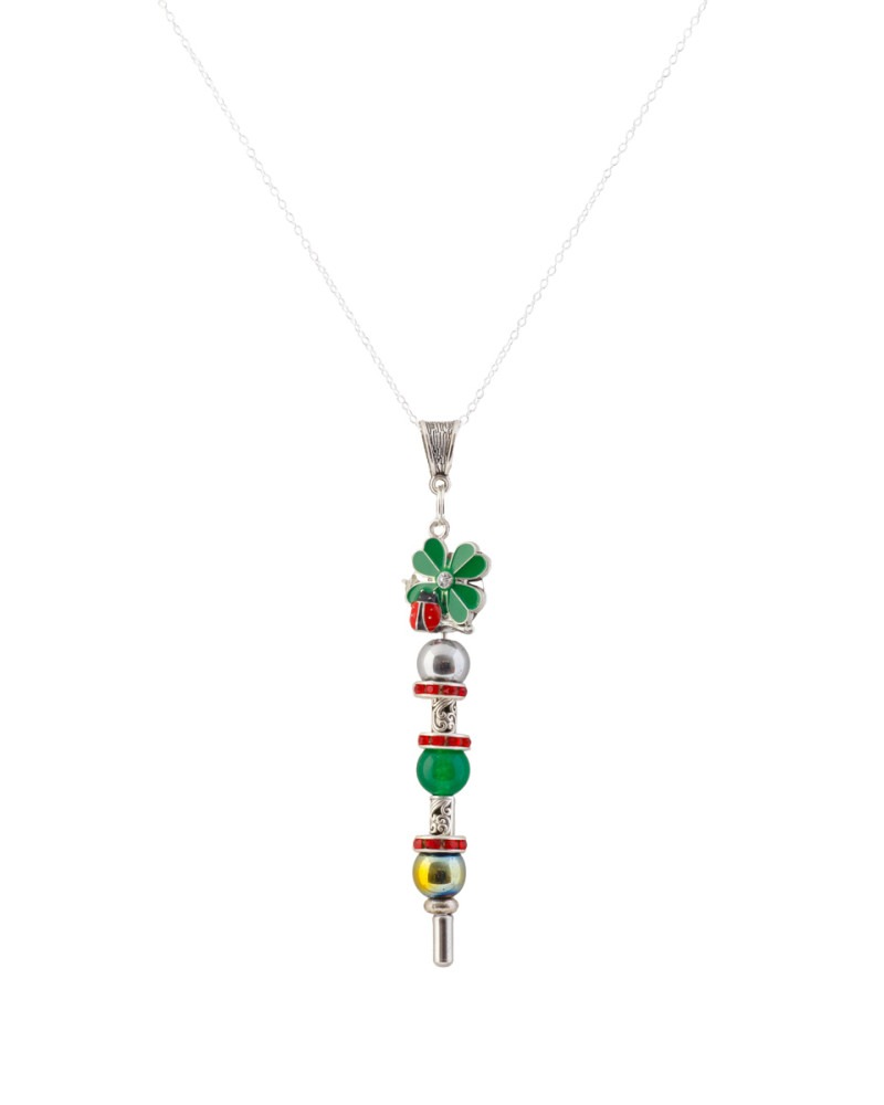 Perles de jade et d'hématite symbole coccinelle et trèfle à 4 feuilles, chaine en argent