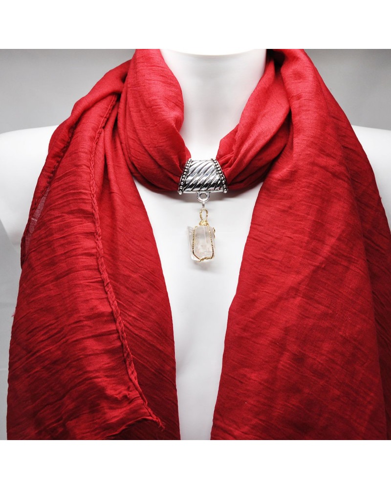 Foulard rouge en lin , bélière et pierre naturelle en quartz blanc sertie de fil doré