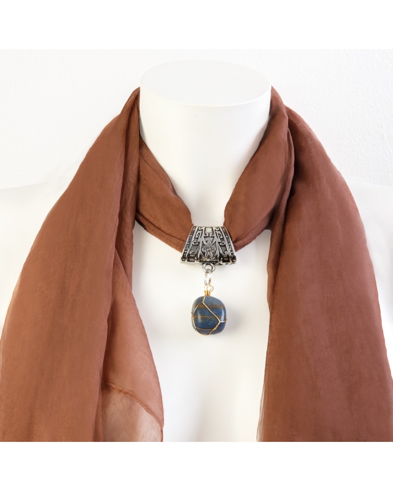 Pierre lapis Lazuri sertie de fil doré attache bélière argentée, foulard en soie marron clair