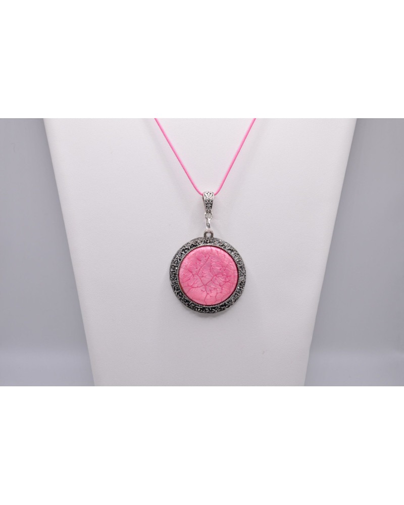 Pendentif argenté pierre rose arrondie encerclée d'une médaille