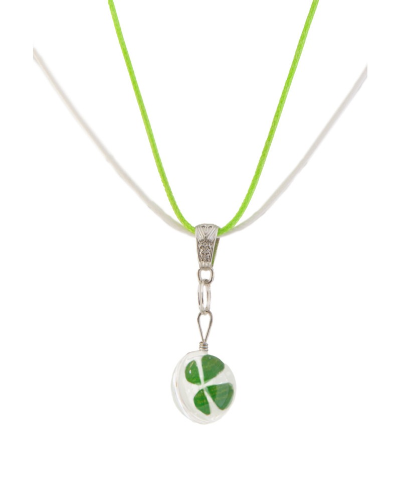Trèfle à 4 feuilles sous verre, porte bonheur, double cordons vert et beige