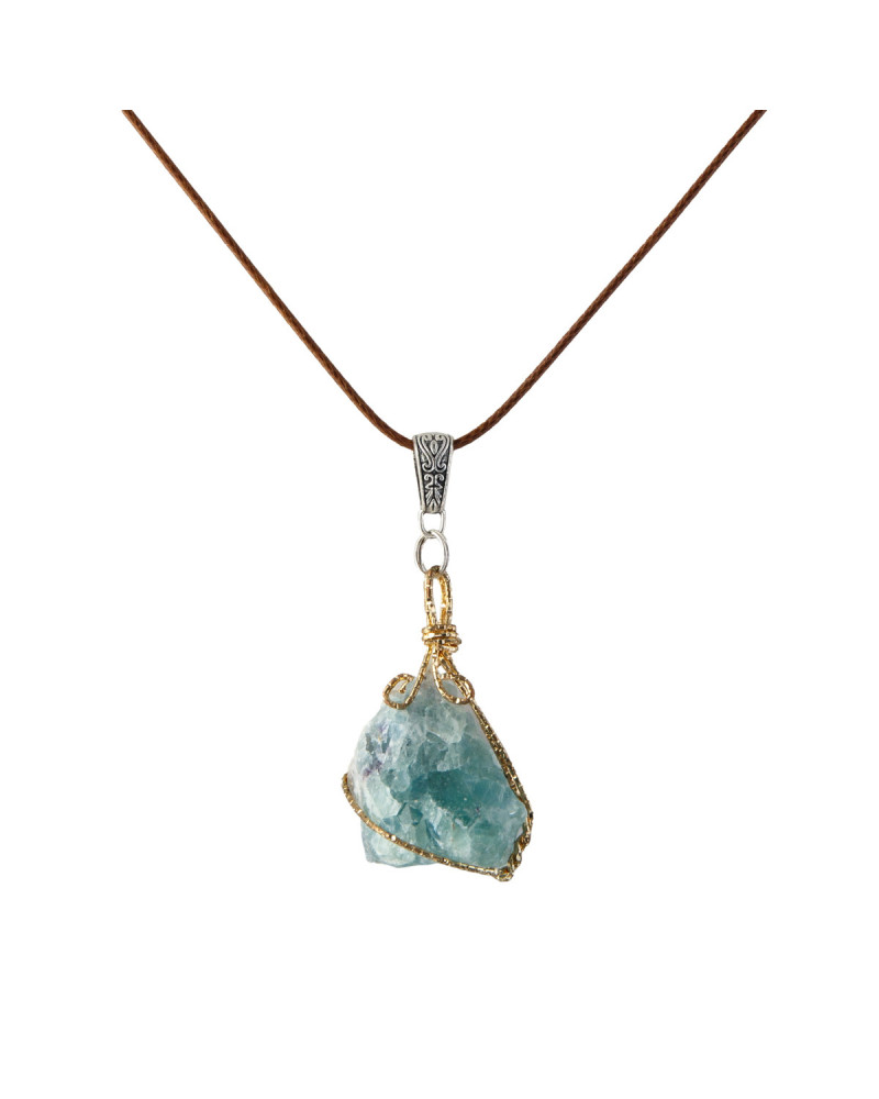 Pierre d'aigue marine sertie de fil doré, cordon marron
