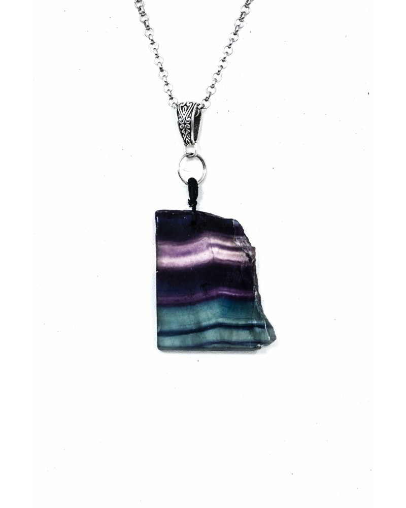 Pierre naturelle de fluorite arc-en-ciel pendentif monté sur bélière argentée, Chaine argentée acier inoxydable