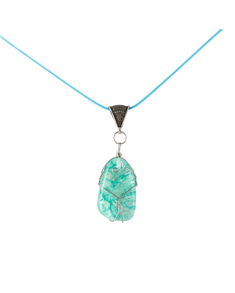 Pierre de quartz verte sertie de fil argenté, cordon vert